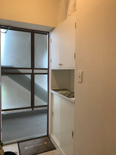 お客様は、元々マンションに備え付けてあった、腰までの引き違いの下駄箱の上にピッタリサイズの収納をお求めでした。